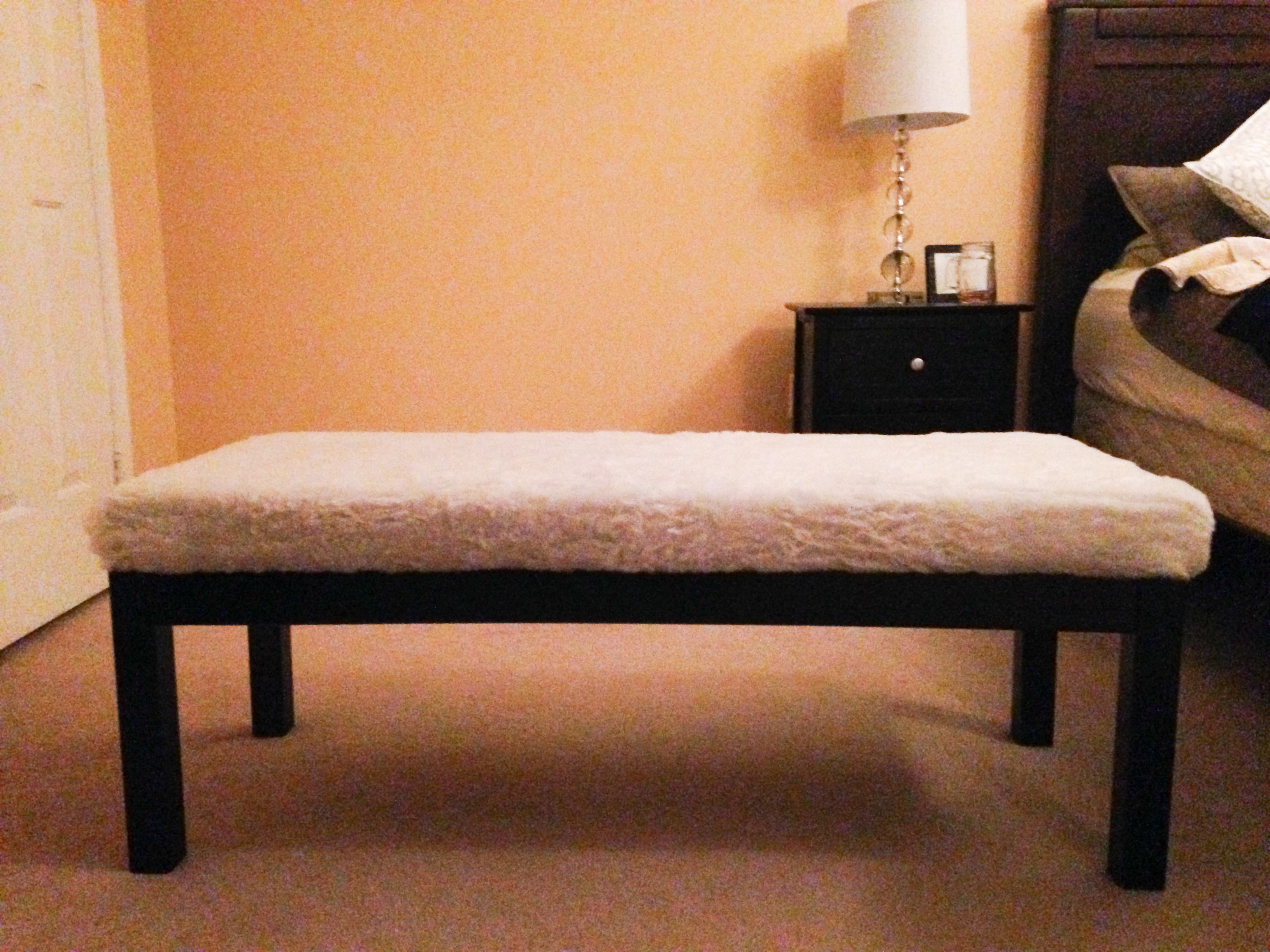 I found this faux fur fabric at Joann’s and the mahogany stain is from Home Depot. It’s funny what a simple change in fabric can do for a plain piece of furniture!