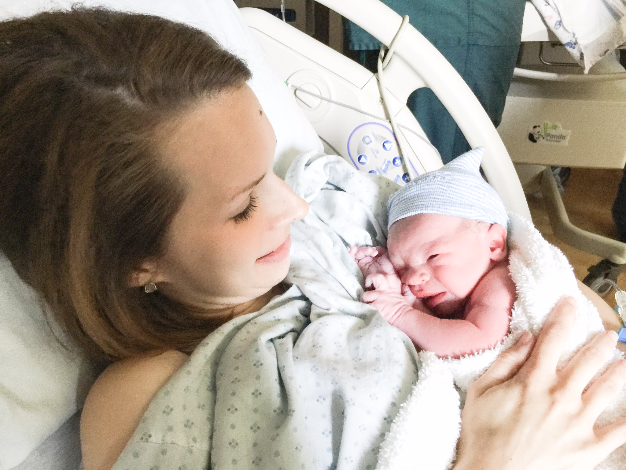 Around 8:00 AM I was finally admitted to the hospital. I walked myself to a good 5 cm dilated, and off we went to our labor and delivery room. I labored, waiting for my water to break now that my mucus plug was gone, but to no avail. After an epidural and at 7 cm dilated, the doctors had me start pushing.