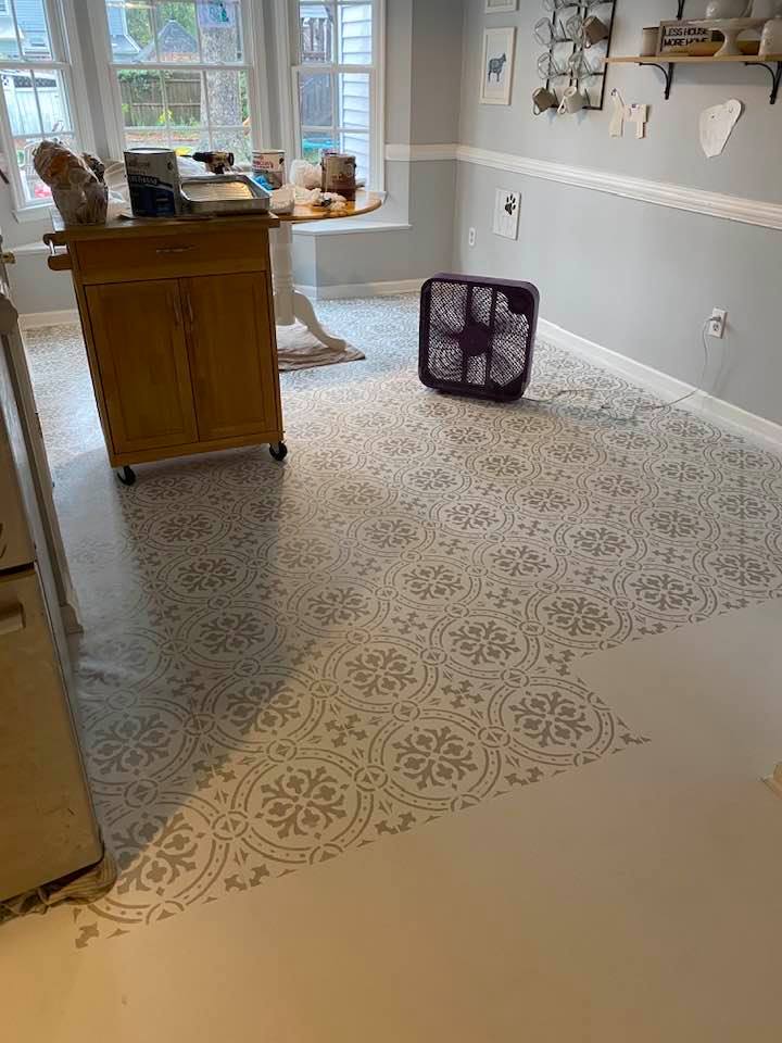 I have two kids and three animals inside, so blocking off the whole kitchen wasn’t an option. The animals needed access to their food and water, the cat’s litter box is in a closet around the corner pictured here, and to the left is our downstairs bathroom. When I began stenciling, it was methodic. I made sure to only be blocking one area of the kitchen at a time. Fortunately, the paint dries very fast, and the stencil dries even faster.
