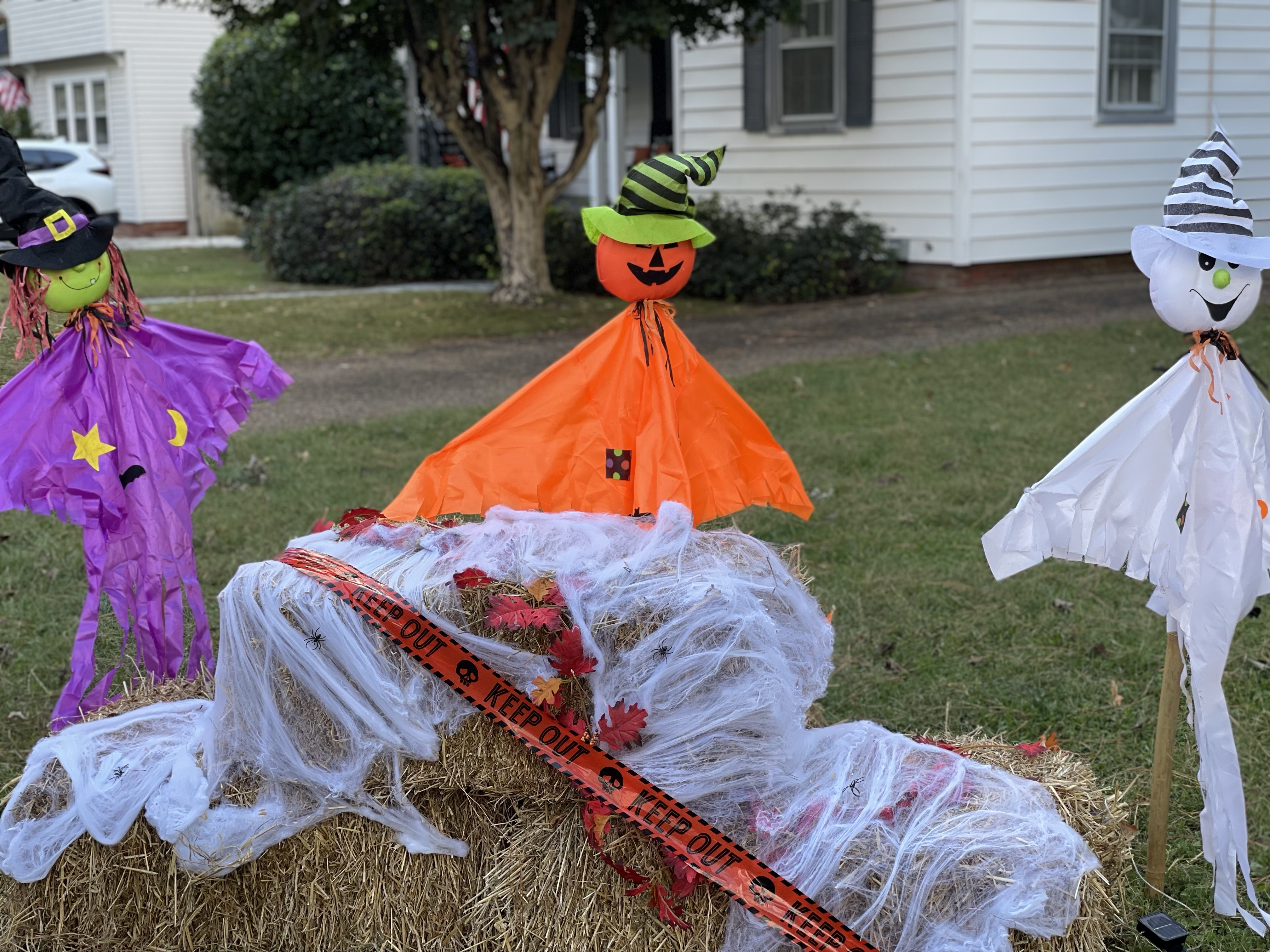 Finding spooky decor always gets me in the Halloween spirit, UNLESS I’m spending a ton of money on it (then it just gets me in a cranky spirit). I love going to the Dollar Tree for my Halloween decor – especially since some of the decorations may not be reusable (like the spider webs, or caution tape). This year, I did a quick wrap of our Fall hay bales, and easily turned them into a Halloween attraction, by only using Dollar Tree decor. I used: one bag of spider web decorations, Keep Out tape, and a garland of red Fall leaves. Voila! I also purchased some of their black rats and mini skeletons, but I won’t be setting those outside until closer to Halloween.