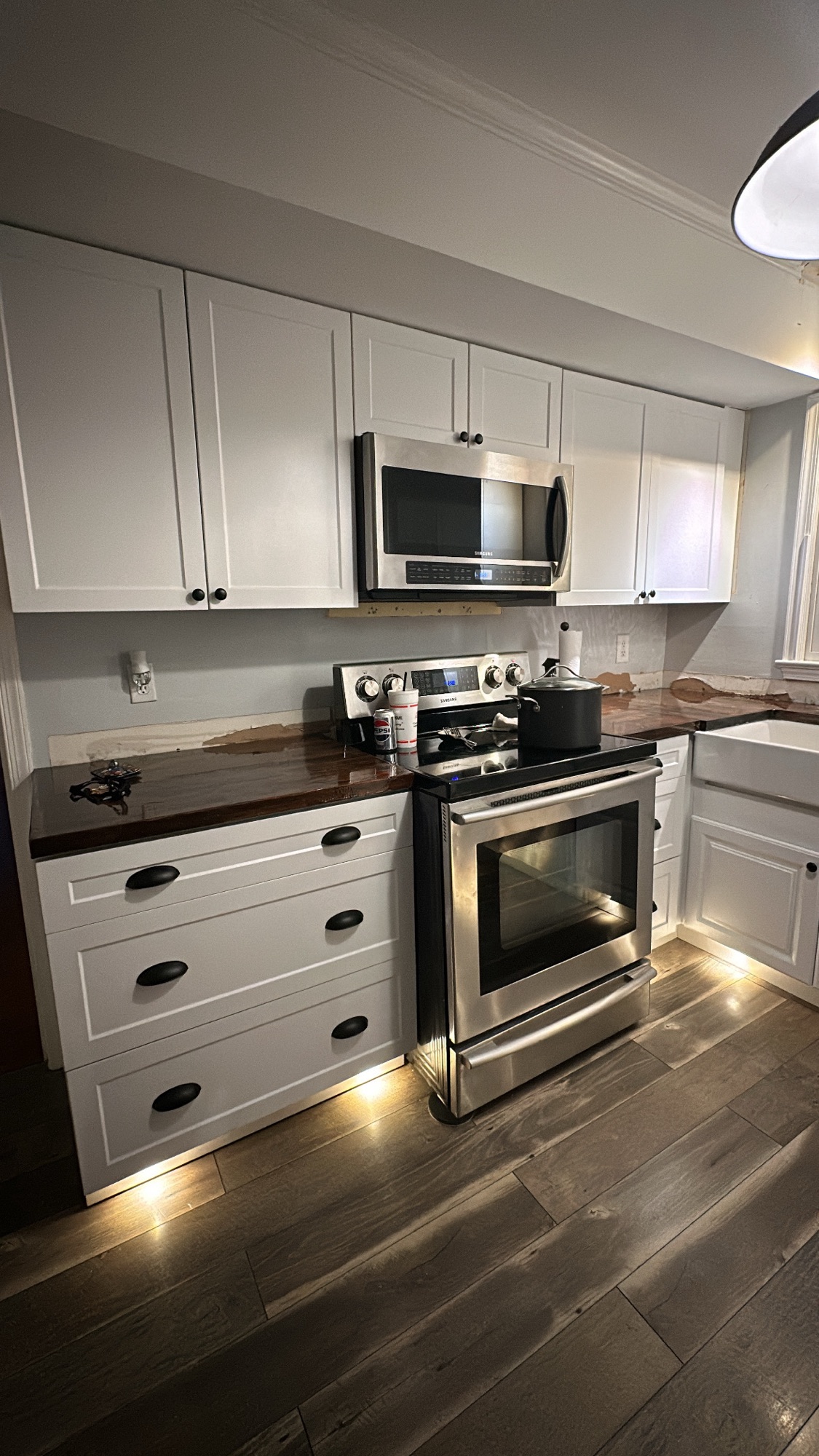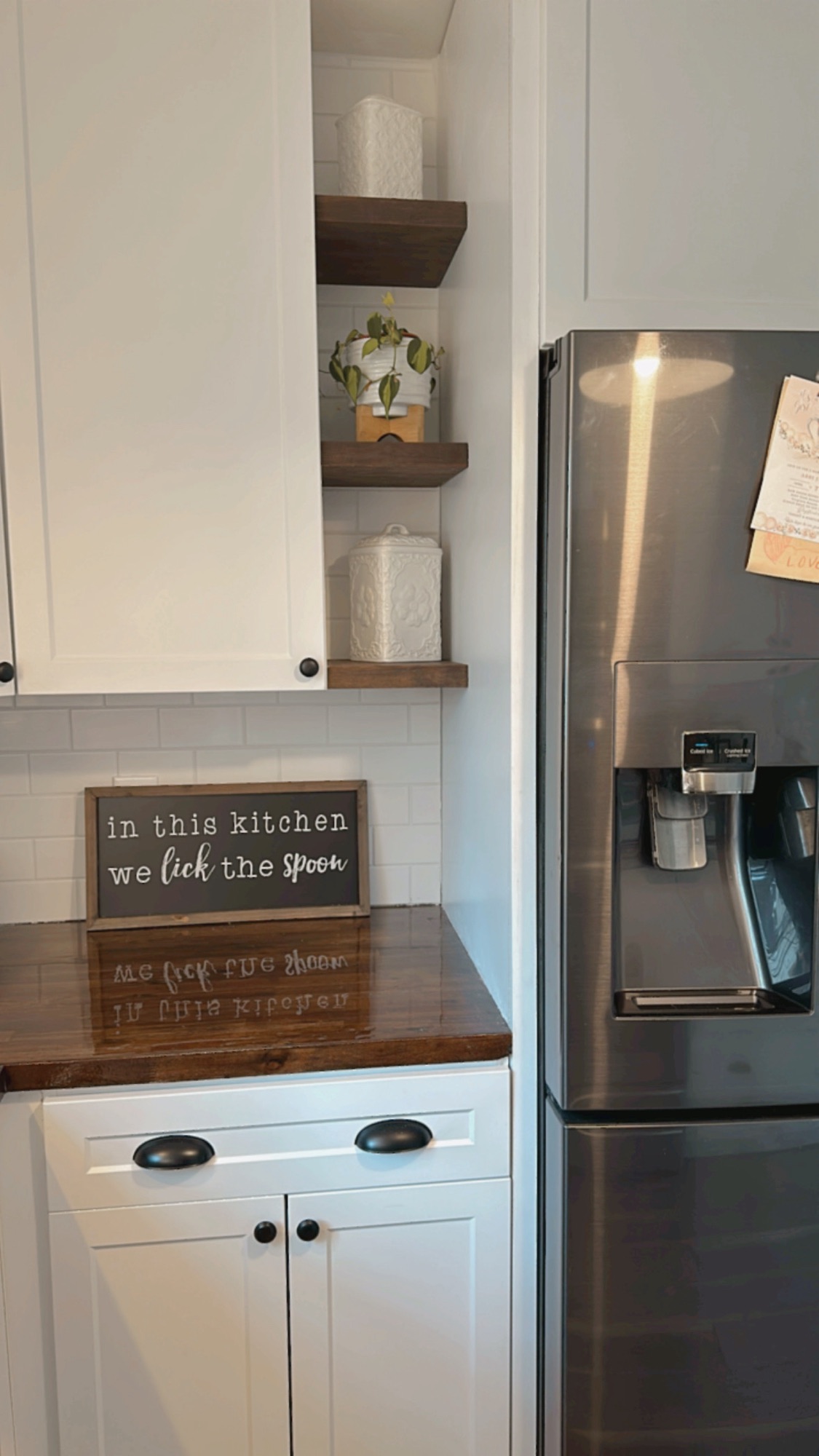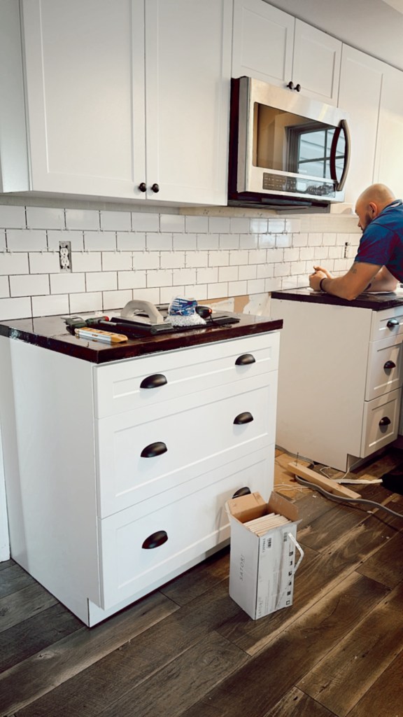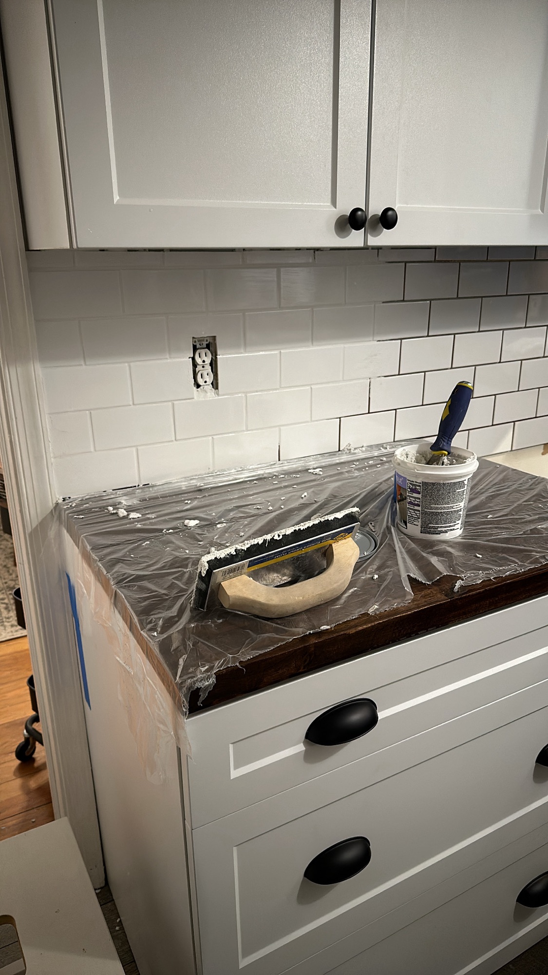 After the tile was laid, we applied white grout on top for a nice finish. It’s such a clean look and makes such a statement! I’m also glad that we (*cough* me) decided to tile the entire exposed walls in the kitchen instead on only doing underneath the cabinets. I think it turned out great!