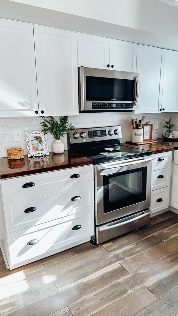 We went with your standard subway tile from Home Depot (for about 15 cents a piecer) and bought about 600 tiles. For our kitchen size we definitely thought we had bought too much and would return some, but we ended up using at least 500 tiles! Pro tip: buy more than you think you’ll need anyway to account for mistakes and breaks.
